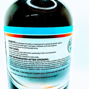 The Diabetes formula is composed of a variety specific organic herbs that may benefit both type 1 and type 2 diabetes and may suppress symptoms of hyperglycemia and hypoglycemia. Supports